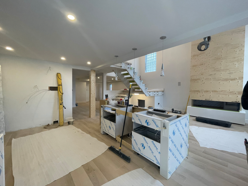 A sleek, modern kitchen became the new heart of the space, complete with custom cabinetry, premium appliances, and a functional island perfect for gathering. To complement the open concept, we installed glass railings with open stair treads, adding architectural interest and a sense of visual continuity across levels.